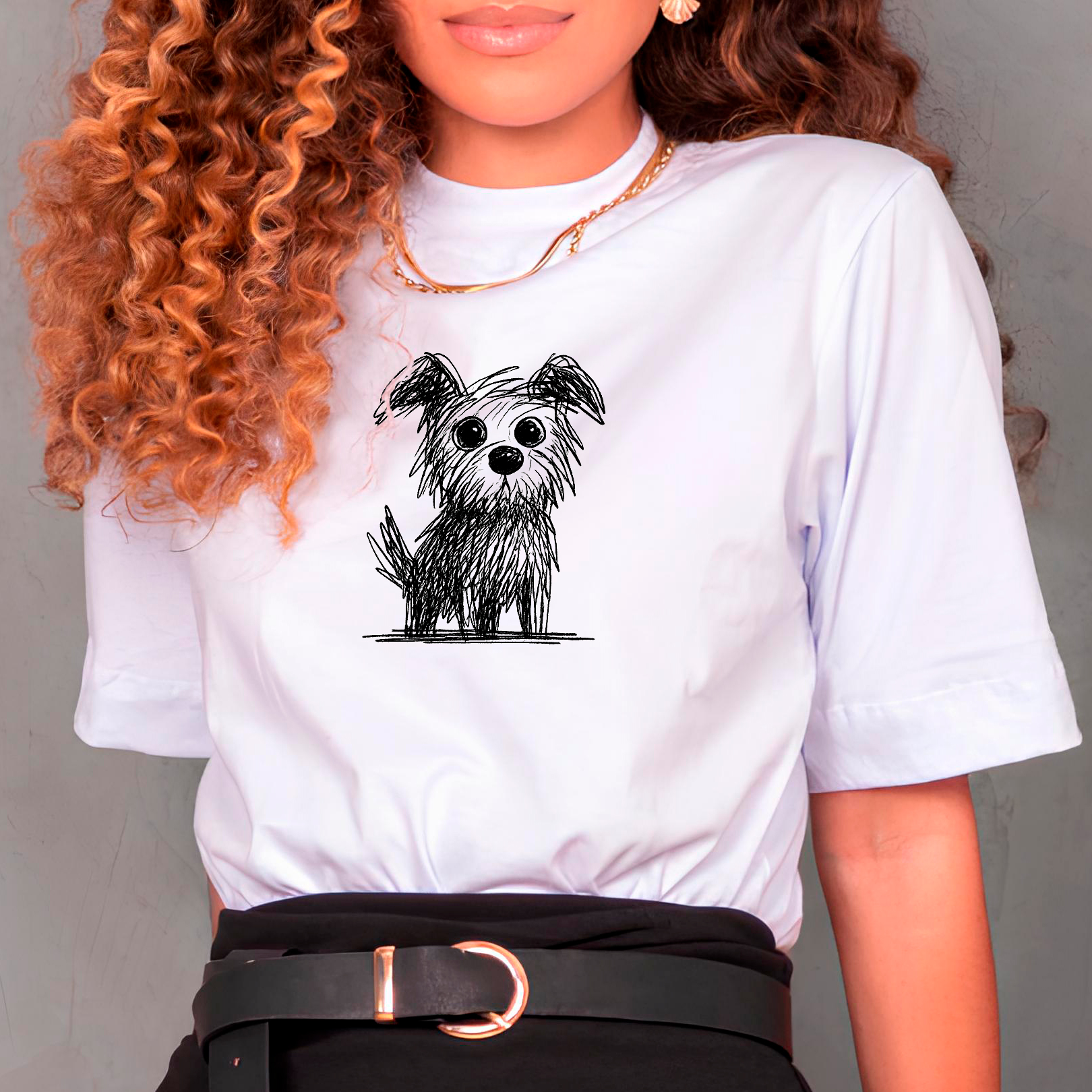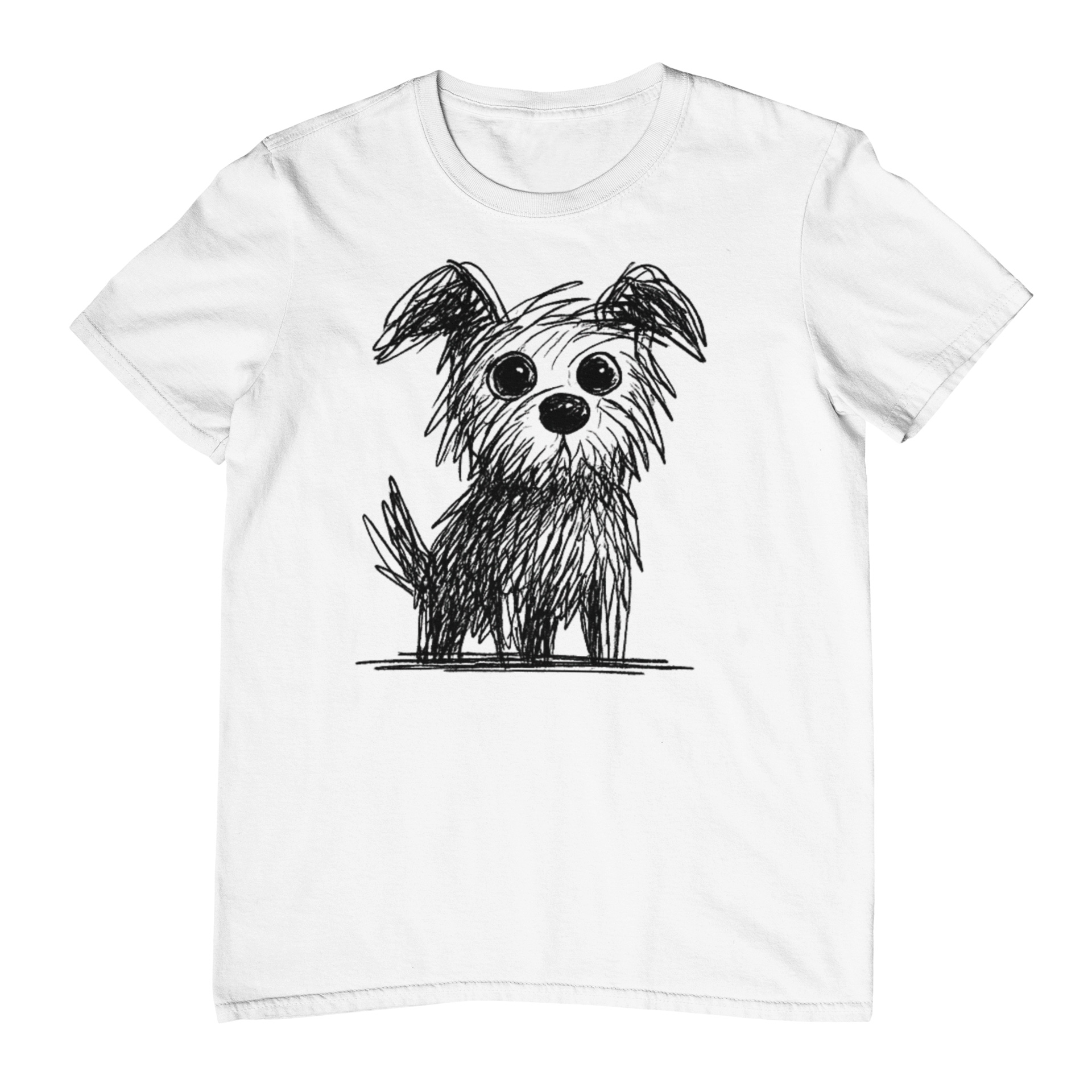 Camiseta cachorro rabiscado Fofinho de Olhos Grandes é aquela peça feita para quem ama doguinho carente, olhar pidão e muita fofura estampada no peito. A arte traz um cachorro todo rabiscado em preto, em estilo sketch, com olhos enormes e expressivos, bem no centro da camiseta, em tamanho próximo a um A4. É o tipo de desenho que parece ter saído direto de um caderno de esboços, mas com cara de personagem principal.