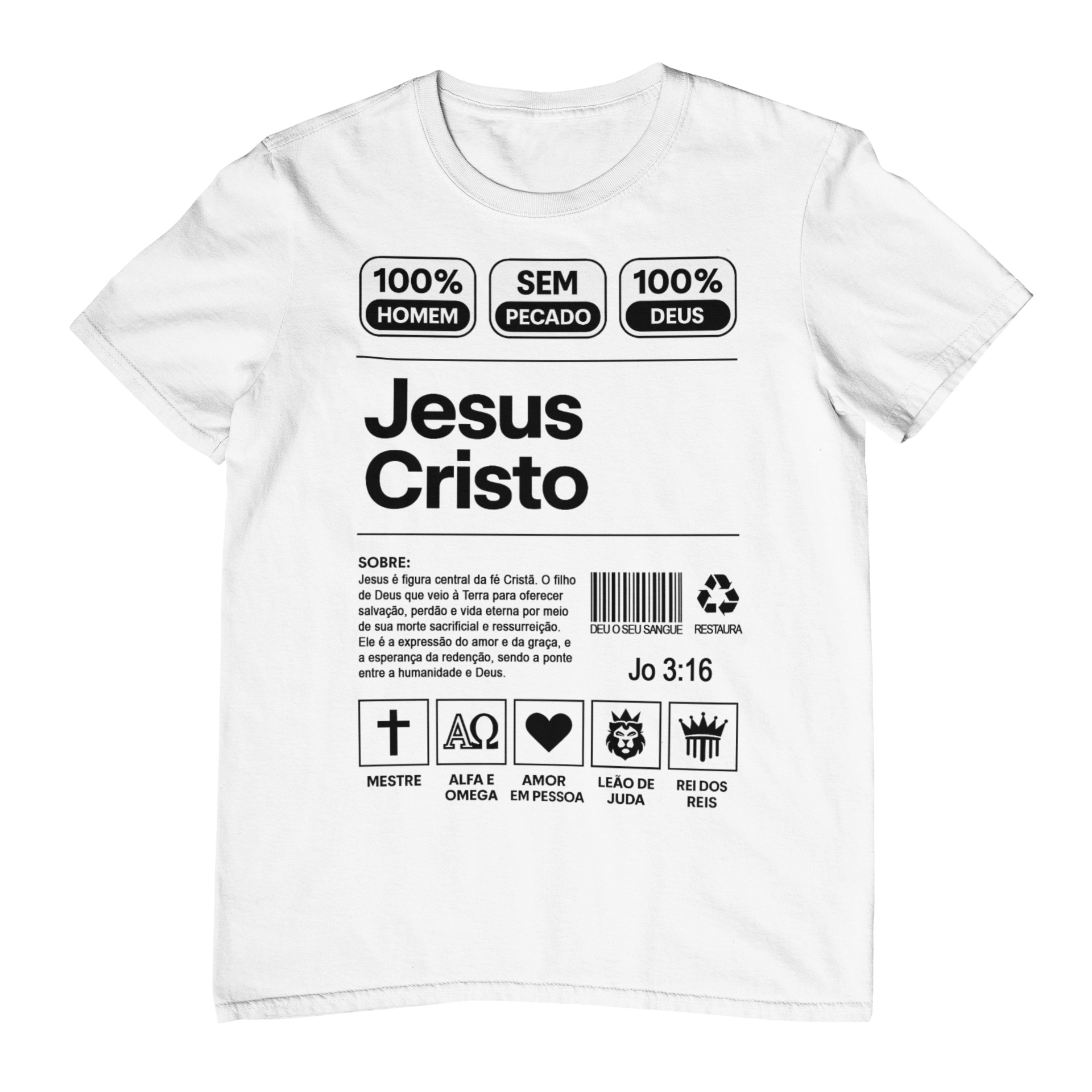 Na parte inferior, um bloco “Sobre” traz um resumo sobre quem é Jesus, com referência a João 3:16, além de ícones e títulos como Mestre, Alfa e Ômega, Amor em Pessoa, Leão de Judá e Rei dos Reis. Tudo isso centralizado no peito, em área aproximada de um A4, criando um visual moderno que lembra ficha técnica ou rótulo, mas entrega um conteúdo totalmente eterno.