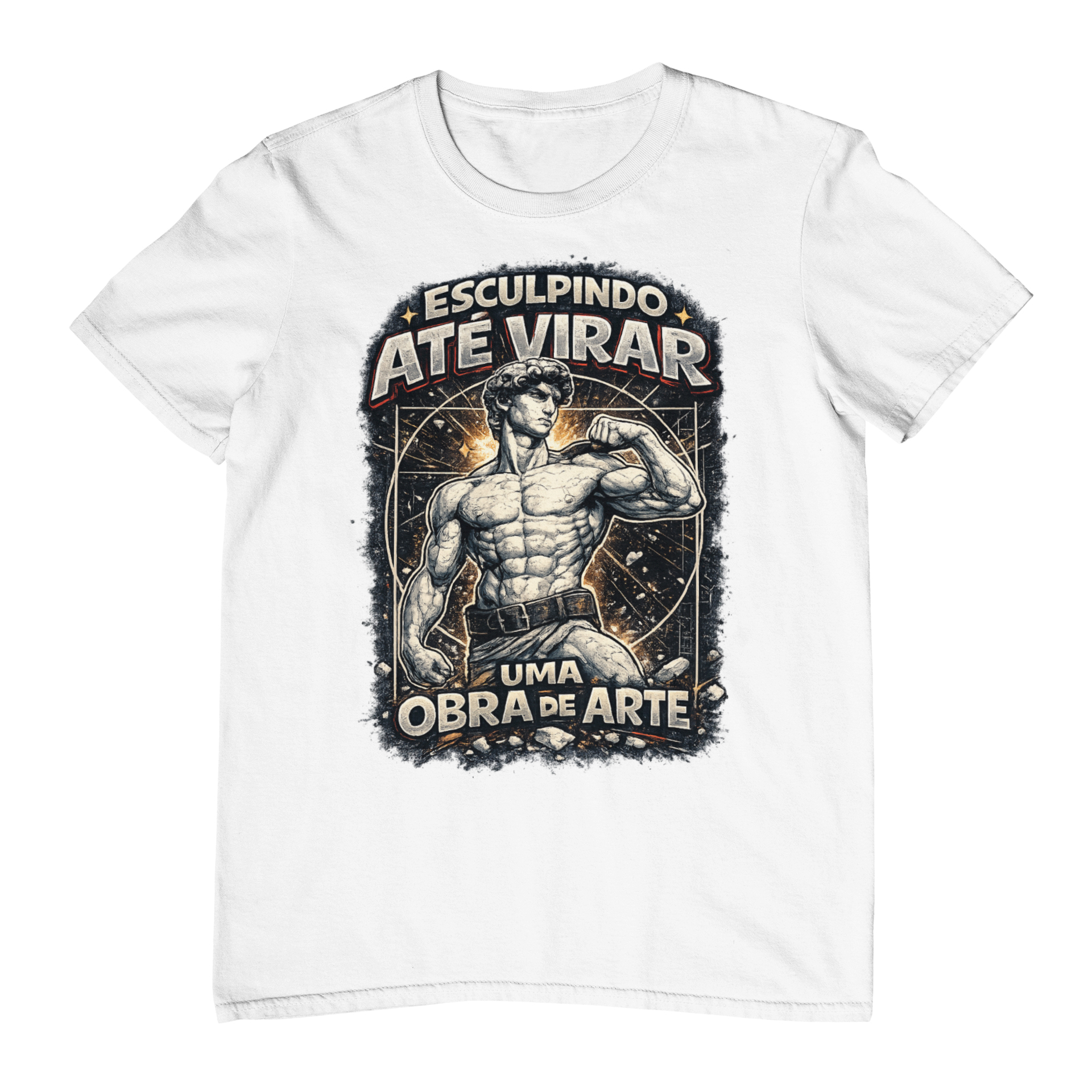 A camiseta esculpindo até virar uma obra de arte é o uniforme oficial de quem decidiu tratar o próprio shape como projeto de escultura. A estampa traz uma estátua masculina musculosa, em pose de fisiculturista, como se o clássico das artes tivesse acabado de sair da academia. Em volta, um fundo com textura artística, linhas e brilhos que lembram pôster de filme épico.