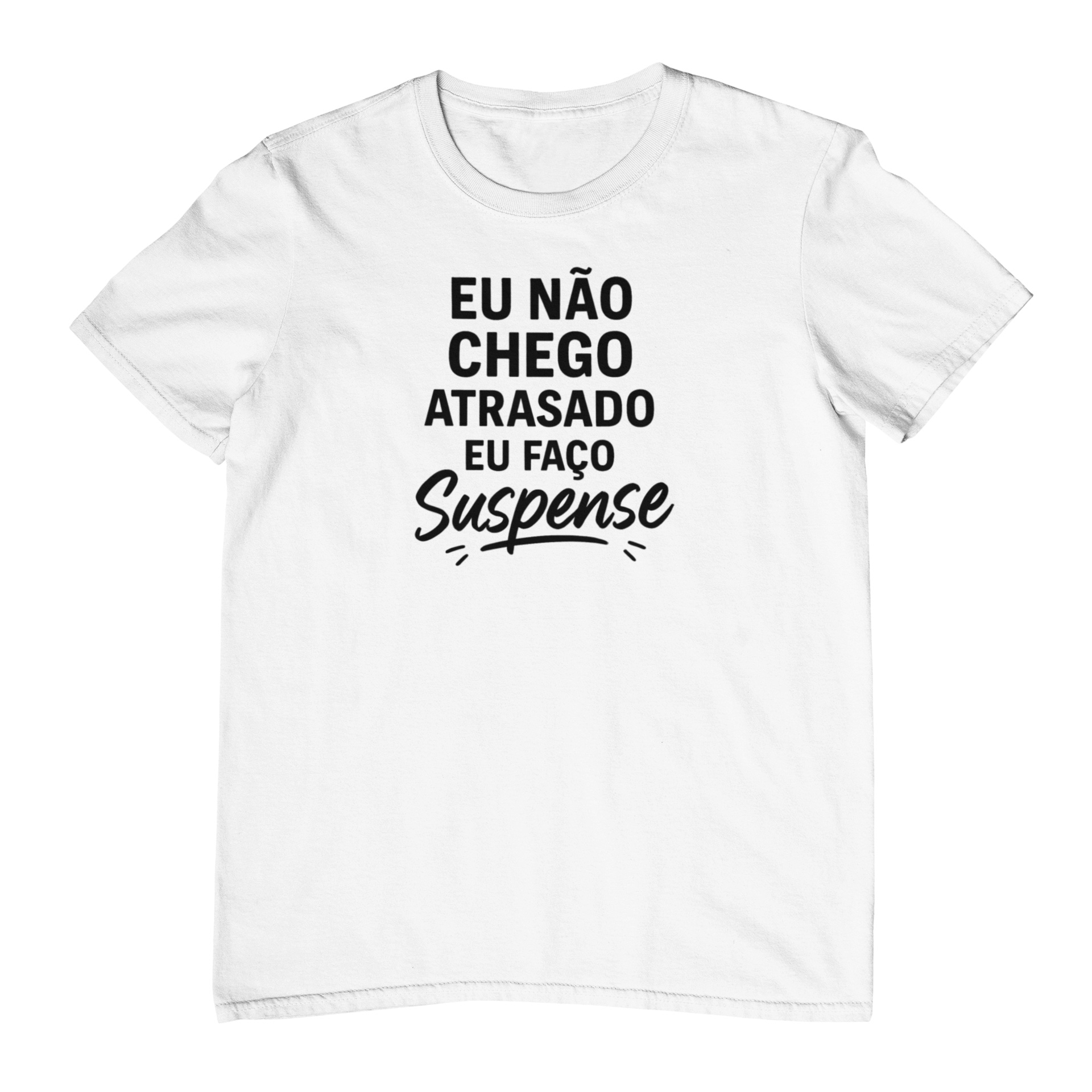 Camiseta eu não chego atrasado eu faço suspense é praticamente o uniforme oficial de quem nunca está na hora, mas sempre chega com estilo. A frase aparece centralizada no peito, em letras grandes e bem legíveis, com a palavra “Suspense” em destaque, em um lettering mais solto e divertido. A estampa ocupa uma área equivalente a um A4, no centro da camiseta, perfeita para ser vista de longe.