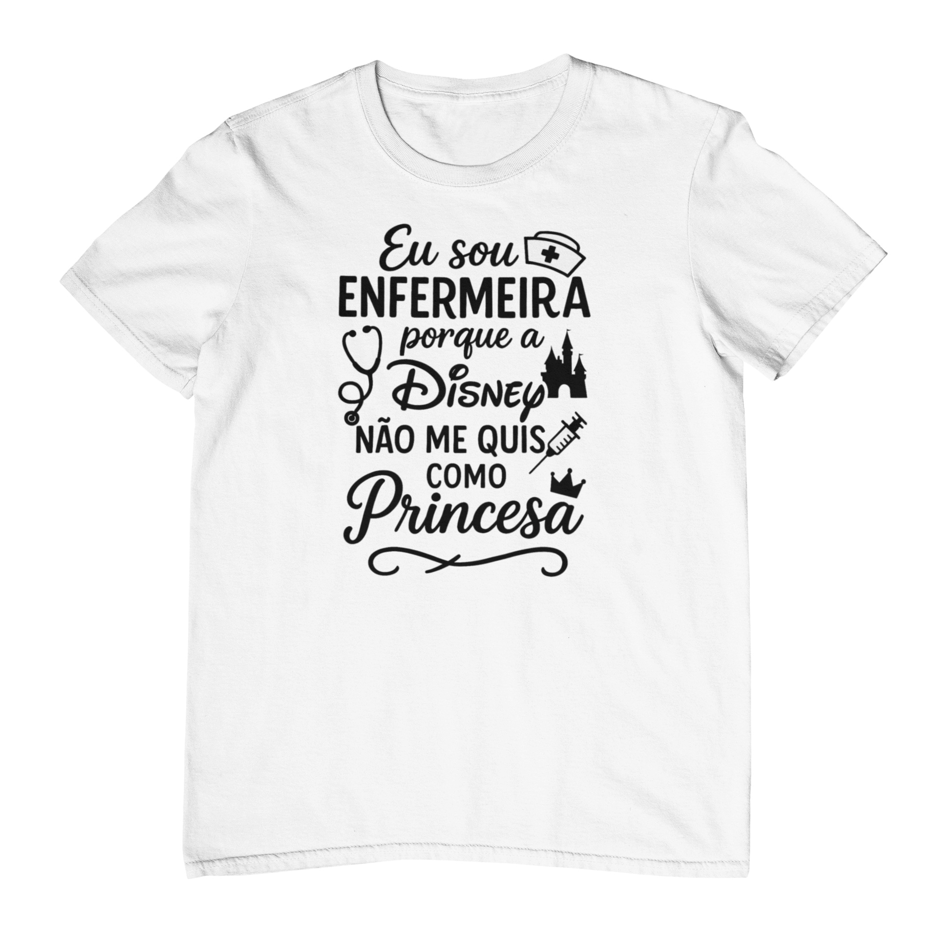 Camiseta eu sou enfermeira porque a Disney não me quis como princesa é para as enfermeiras que já entenderam que não viraram princesa de desenho, mas viraram heroína da vida real. A estampa traz a frase completa em destaque no centro do peito, em composição com ícones fofos de enfermagem e conto de fadas: touquinha de enfermeira, estetoscópio, castelo, seringa e coroinha. Tudo em preto, em tamanho aproximado de um A4, bem legível e cheio de personalidade.