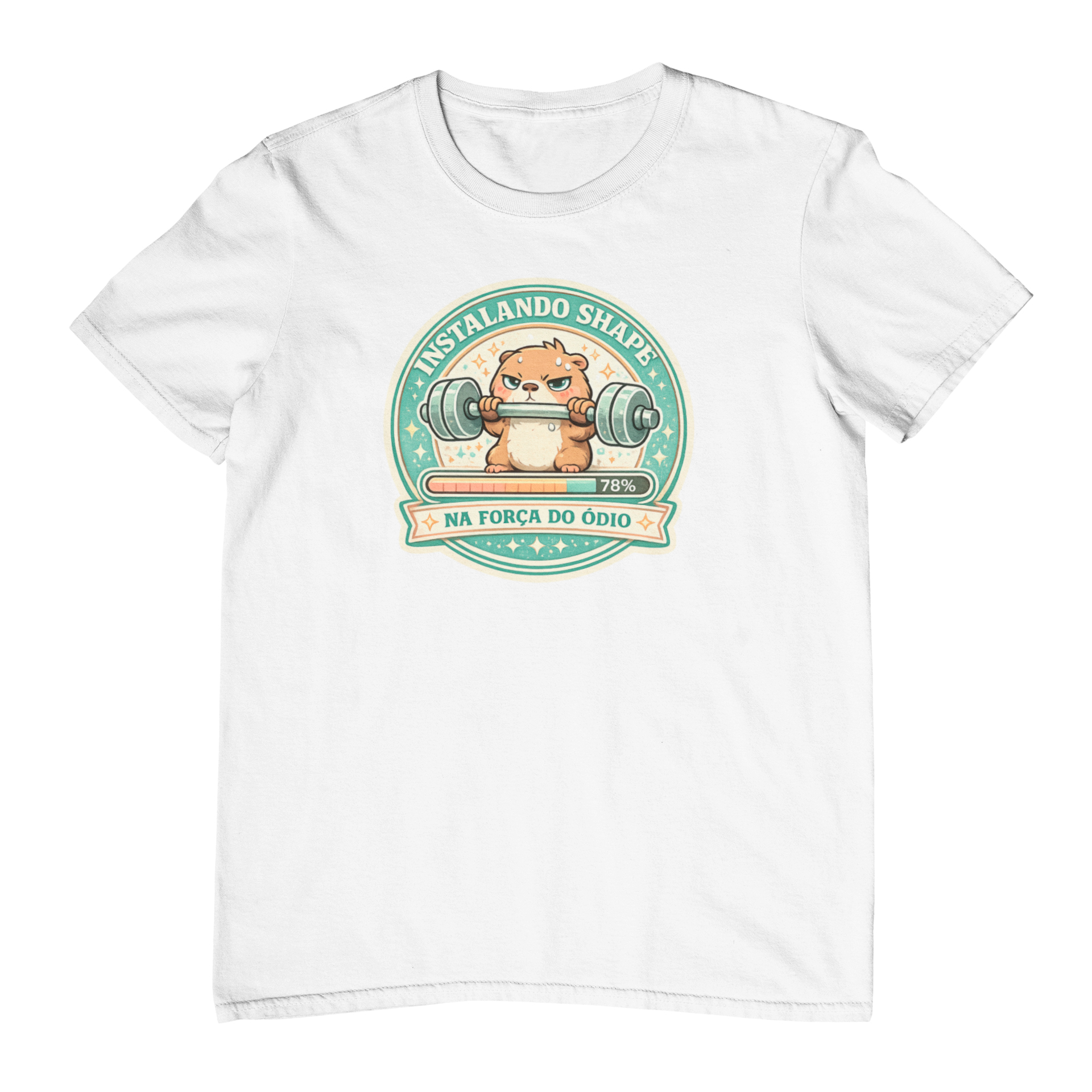 A camiseta instalando shape na força do ódio foi feita para quem não nasceu motivado, mas vai mesmo assim. A estampa traz um bichinho fofinho em estilo pet cartoon, segurando uma barra com anilhas enormes, cara de bravo e barra de “carregamento” marcando 78%. Em volta, um selo redondo cheio de estrelinhas com as frases “Instalando shape” e “Na força do ódio”.