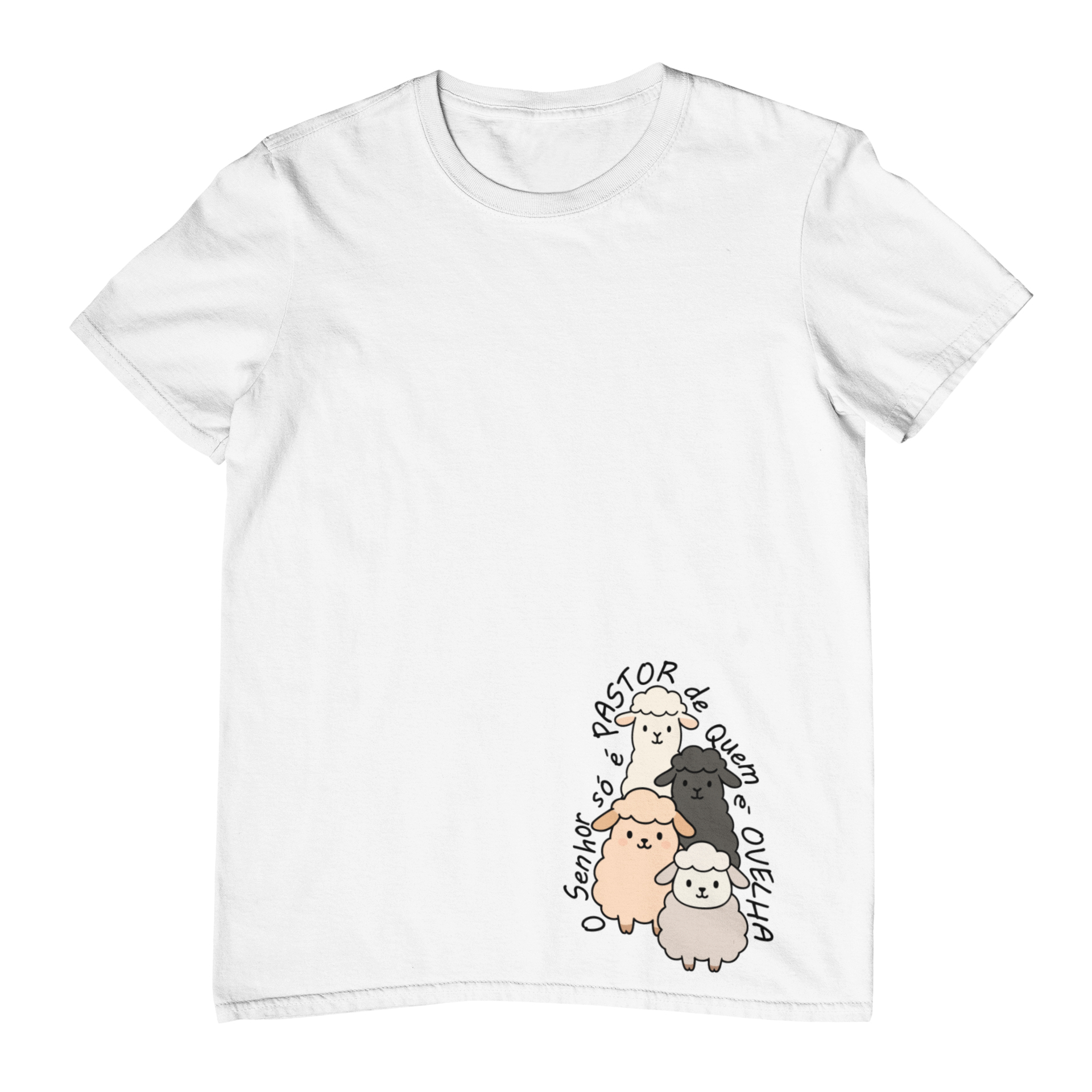 A camiseta o Senhor só é pastor de quem é ovelha é daquelas que pregam com fofura. A estampa traz um grupinho de ovelhas em estilo super cute, em tons suaves de bege, rosa, marrom e preto, posicionadas na parte inferior direita da frente da camiseta, em tamanho próximo a um A5. Ao redor delas, a frase em forma de arco: