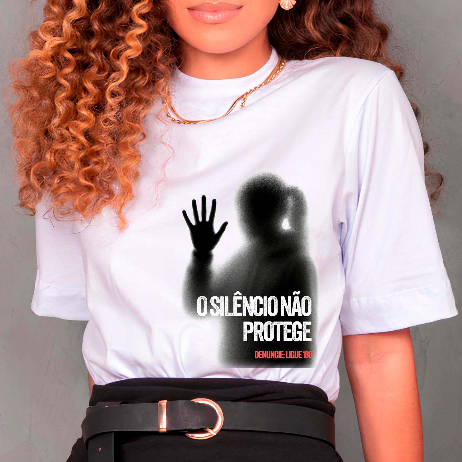 procura uma camiseta forte, séria e direta para falar sobre denúncia e proteção