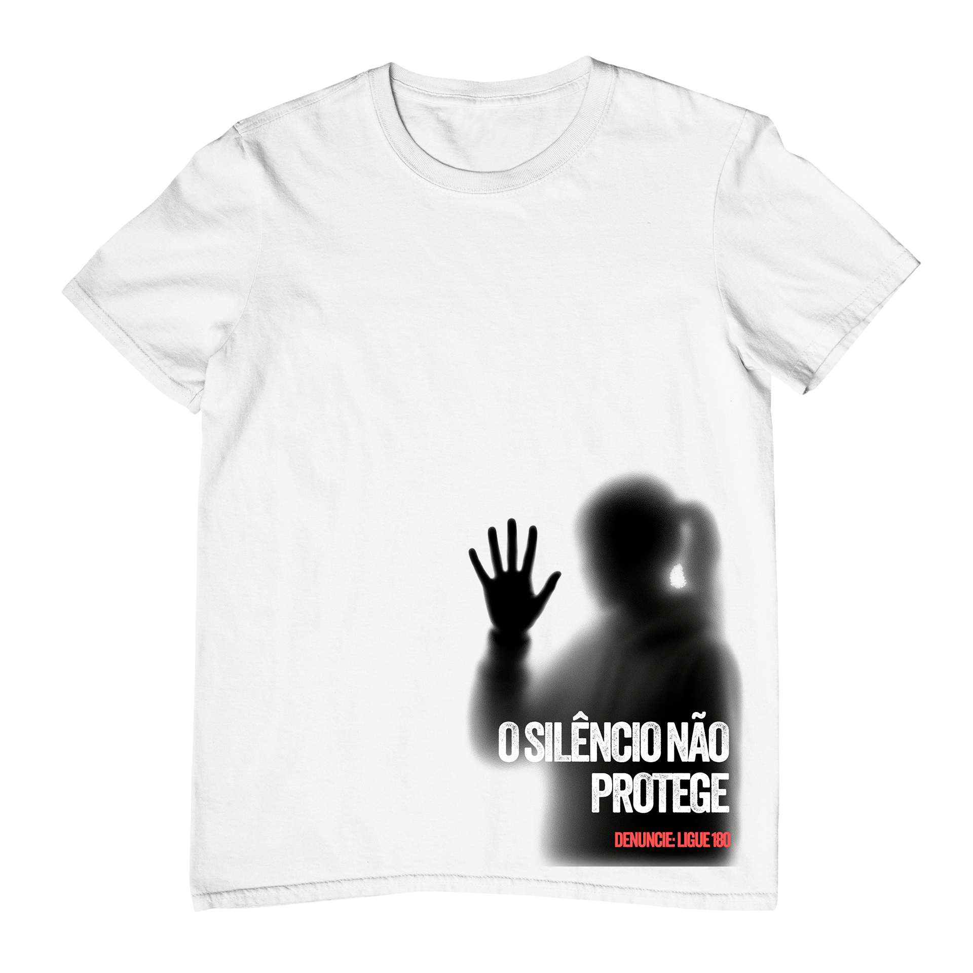 A camiseta o silêncio não protege foi criada para quem não aceita mais fechar os olhos diante da violência. A estampa traz a silhueta desfocada de uma pessoa com a mão espalmada contra uma superfície, em preto e cinza, transmitindo sensação de pedido de ajuda. Na base da imagem, a frase “O SILÊNCIO NÃO PROTEGE” aparece em branco, em destaque, seguida do alerta em vermelho “DENUNCIE LIGUE 180”.