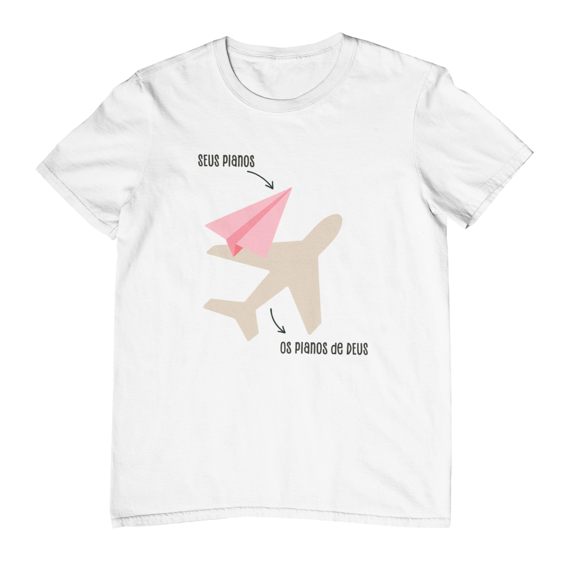 Camiseta seus planos os planos de Deus é para quem já percebeu que, por mais que a gente planeje, o que Deus prepara é sempre bem maior. A estampa mostra um aviãozinho de papel rosa com a frase “seus planos” e, logo abaixo, um avião grande com a frase “os planos de Deus”, tudo no centro do peito, em um tamanho aproximado de A4, fácil de ver e se identificar.