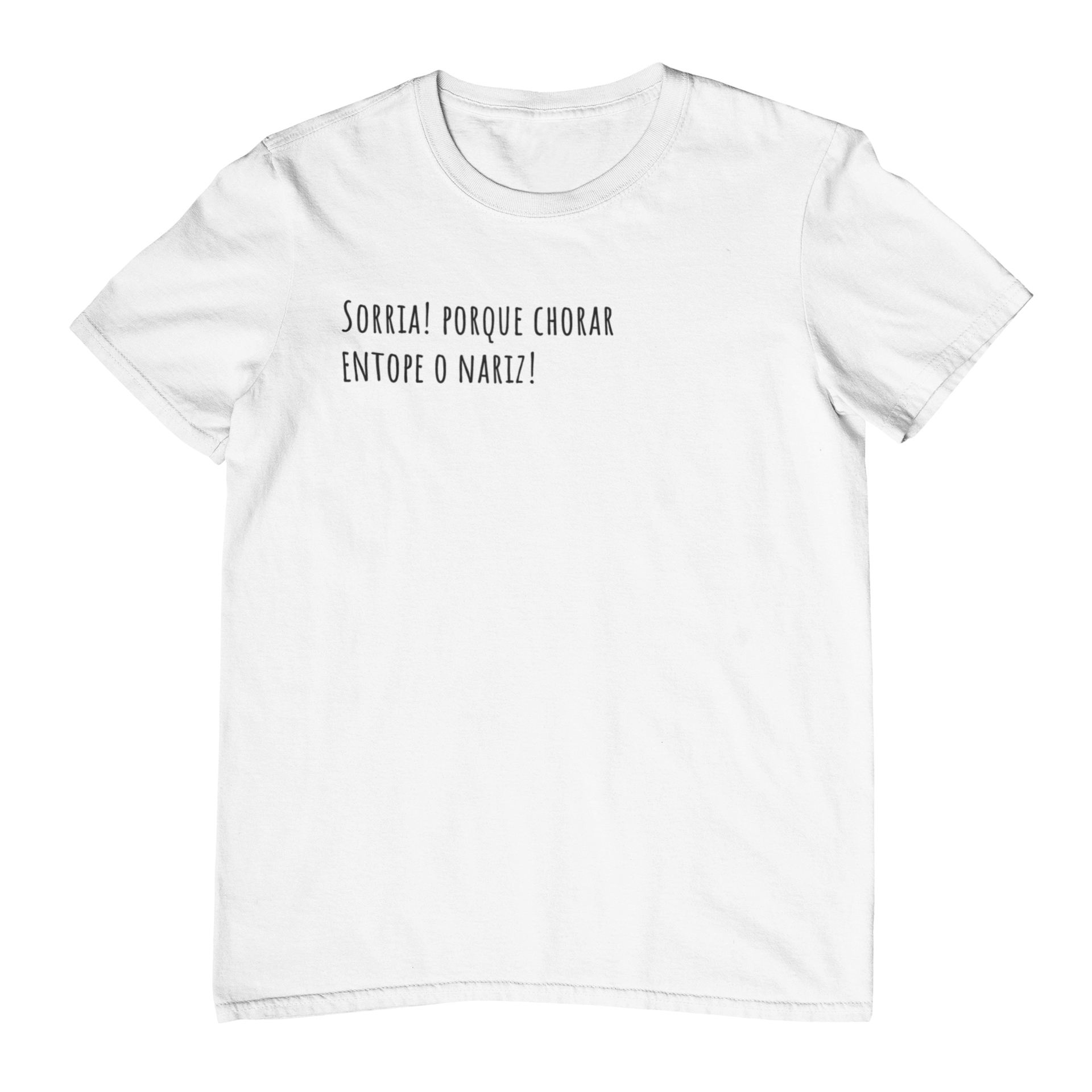 A camiseta sorria porque chorar entope o nariz é praticamente um conselho médico com carinha de meme. A frase “Sorria! porque chorar entope o nariz!” aparece centralizada na parte superior do peito, em letras pretas simples, lembrando texto digitado. É aquele recado direto e bem-humorado para lembrar que, se a vida apertar, às vezes o melhor é rir para não gastar caixa de lenço.