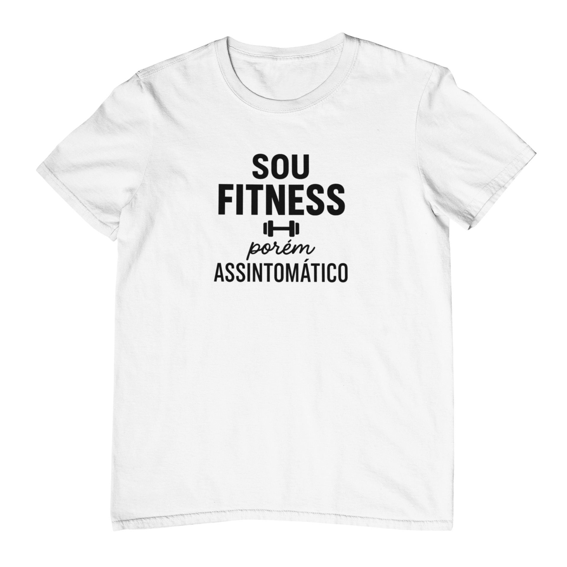 Camiseta sou fitness porém assintomático é para quem vive dizendo “amanhã eu começo” desde 2010. A estampa traz a frase em destaque no centro do peito, em letras grandes e bem legíveis, com um halterzinho no meio para representar aquela vida fitness que… ainda não se manifestou no shape. Tudo em preto, em área aproximada de um A4, deixando o humor bem claro logo de cara.